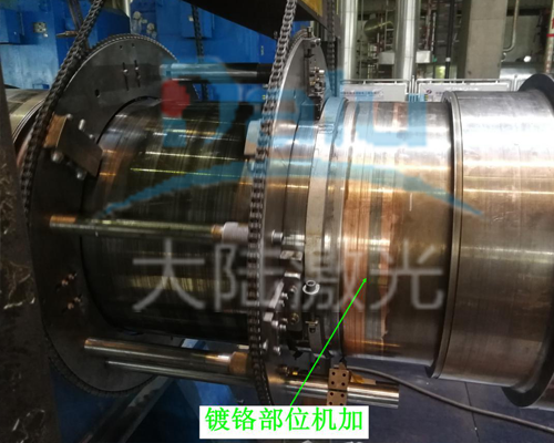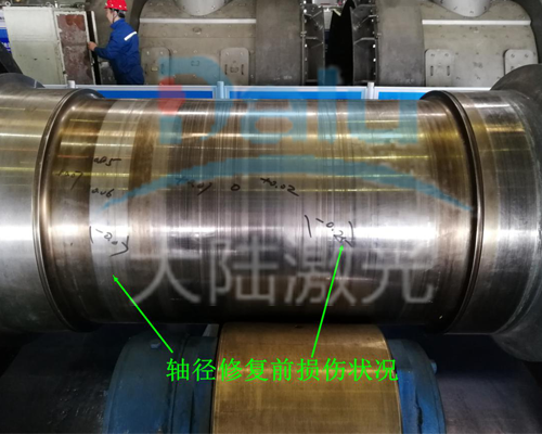 2019年11月18日大陸激光在山東聊城電廠現(xiàn)場,對70噸發(fā)電機組一個主軸徑及兩處密封軸徑,三個損傷部位進行了現(xiàn)場激光再制造修復。該發(fā)電機是由德國西門子公司生產的,因長時間超負荷運轉,造成非驅動端軸主軸徑磨損、拉傷,損傷深度約為0.5mm。兩處密封軸徑磨損,存在漏氫現(xiàn)象,曾做刷鍍處理,使用一段時間后仍然漏氣,效果不理想,已經嚴重影響機組正常運行,需對損傷軸頸進行修復,恢復原始尺寸。為解決漏氣問題,大陸激光組織人員及相關設備前往現(xiàn)場進行修復。