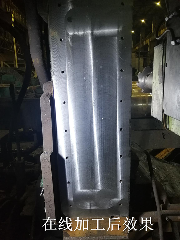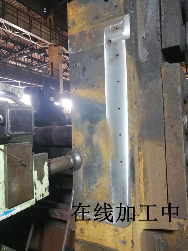 2020年5月20日,我公司組織20余人的施工隊(duì)伍進(jìn)入現(xiàn)場(chǎng),對(duì)粗軋機(jī)所有窗口襯板面進(jìn)行在線加工,激光修復(fù),單塊損傷量大約在2-3mm,最深腐蝕加工量達(dá)到8mm,經(jīng)過(guò)180多小時(shí)不間斷連續(xù)施工,提前36小時(shí)順利完成維修任務(wù),恢復(fù)牌坊使用精度要求,一次交檢合格,獲得了廠家認(rèn)可和贊揚(yáng)。